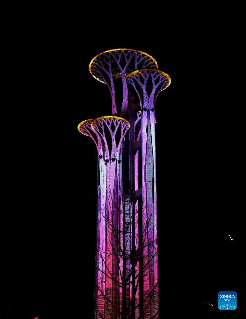 Photo taken on Jan. 29, 2022 shows a light show at the Beijing Olympic Tower in Beijing, capital of China. (Xinhua/Ding Xu)