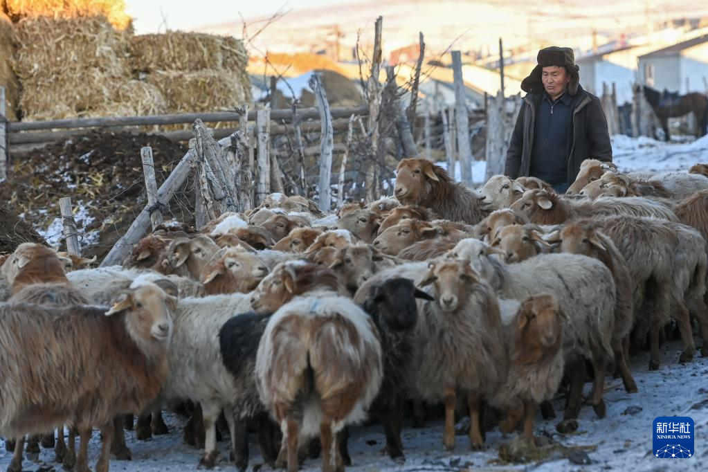 A herdsman drives sheep back to a pen in Karadala Township of Tekes County, northwest China's Xinjiang Uygur Autonomous Region, Jan. 27, 2022. Herdsmen in Xinjiang had lived a nomadic life for centuries. Under a housing project to benefit hundreds of households of local herdsmen, local authorities have initiated construction of supporting facilities to help herdsmen's settlement. It helps herdsmen to start a new life with better medical, educational, cultural and health facilities. (Xinhua/Ding Lei)