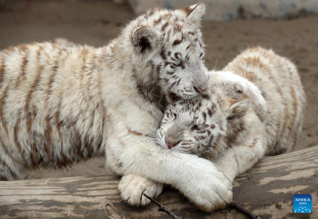 Photo taken on Jan. 29, 2022 shows twin cubs of white Bengal tiger at the Nantong Forest Safari Park in Nantong, east China's Jiangsu Province. While the Year of the Tiger approaches, tigers in zoos are in the spotlight and attract a lot of attention from visitors in China. (Photo by Xu Congjun/Xinhua)