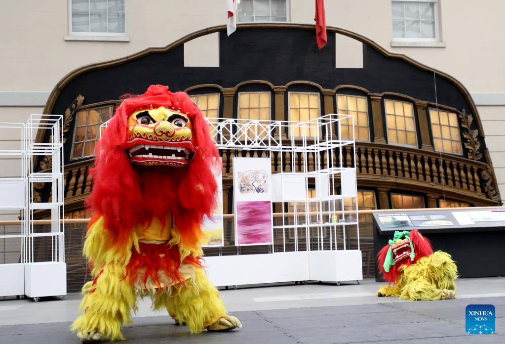 Artists perform traditional Chinese lion dance during a Chinese Lunar New Year celebration held in National Maritime Museum in London, Britain, Jan. 29, 2022. (Xinhua/Li Ying)