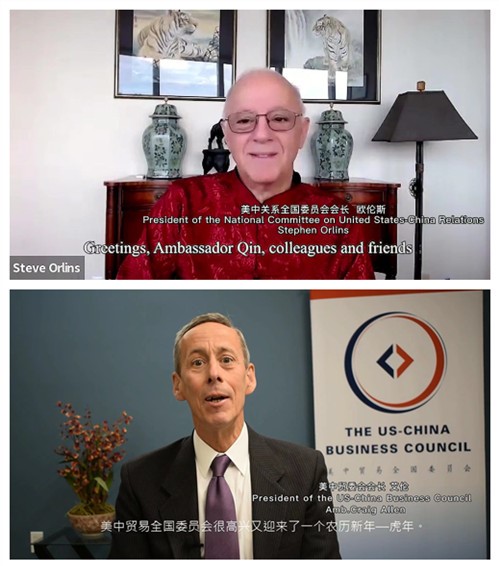 The combo photo shows Stephen Orlins, president of the National Committee on U.S.-China Relations, and Craig Allen, president of the U.S.-China Business Council, delivering congratulatory remarks during the online reception for the Chinese New Year held by the Chinese Embassy in the United States on Jan. 30, 2022. (Xinhua)