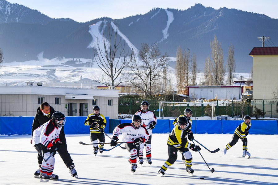 Students from primary section of No.1 Middle School of Urumqi County play ice hockey in Urumqi County, northwest China's Xinjiang Uygur Autonomous Region, Jan. 12, 2022. (Xinhua/Wang Fei)