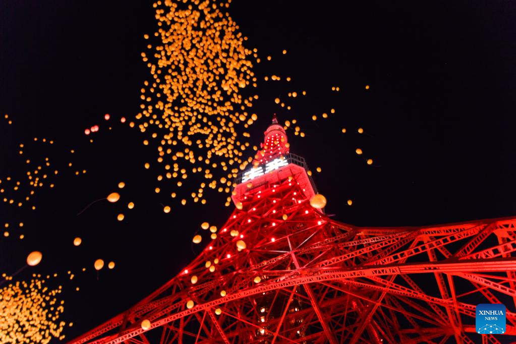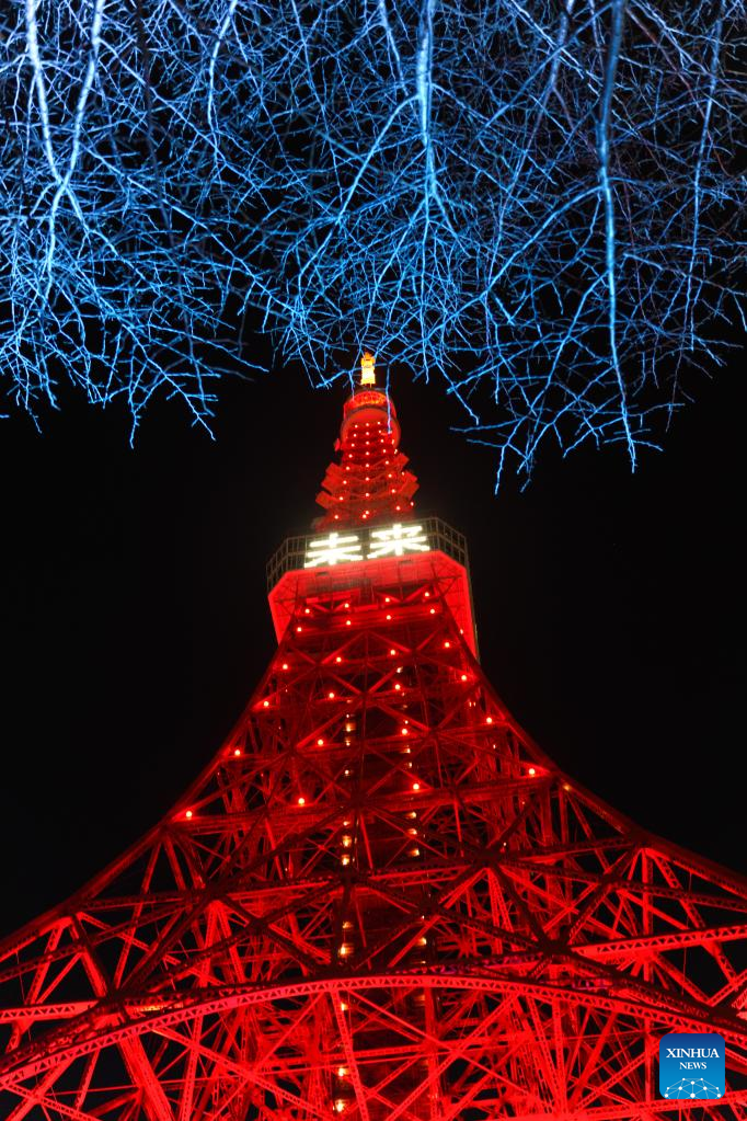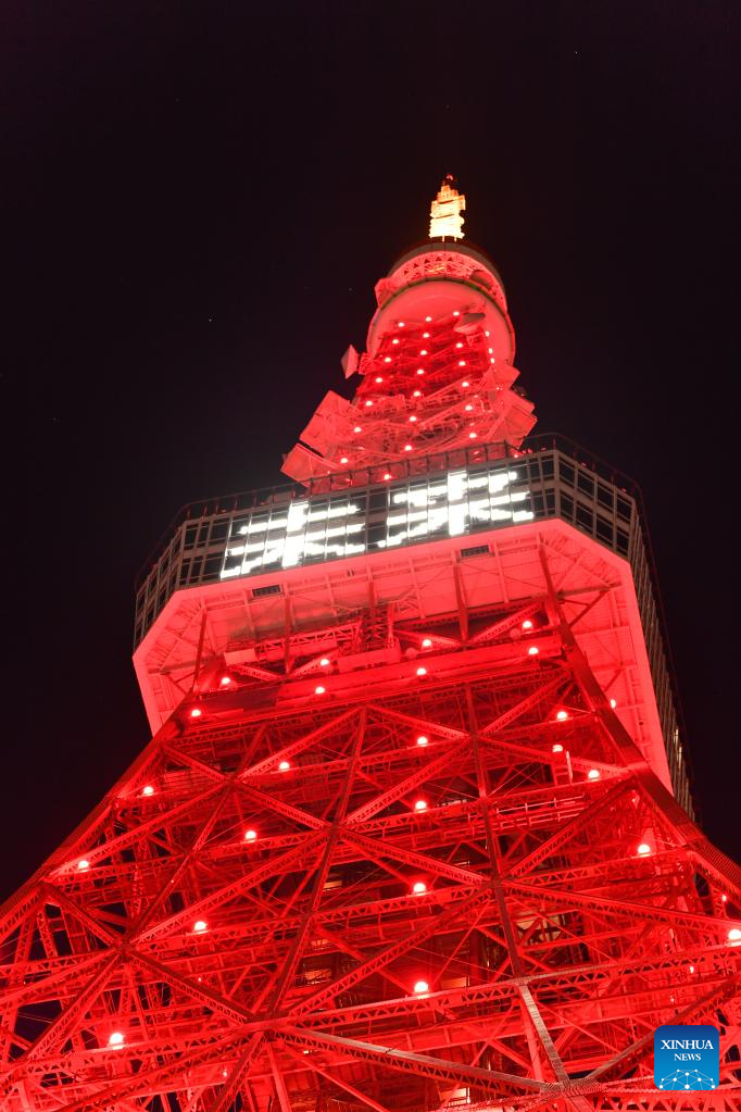 Tokyo Tower is lit up in Chinese red to celebrate the Chinese Lunar New Year, in Tokyo, Japan, Jan. 31, 2022. (Xinhua/Zhang Xiaoyu)