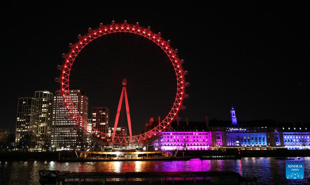 Photo taken on Jan. 31, 2022 shows the London Eye illuminated in red to celebrate the Chinese Lunar New Year in London, Britain. (Xinhua/Li Ying)