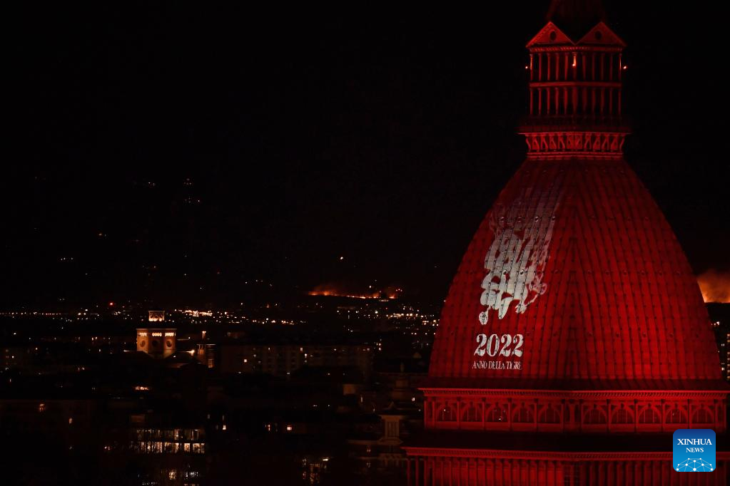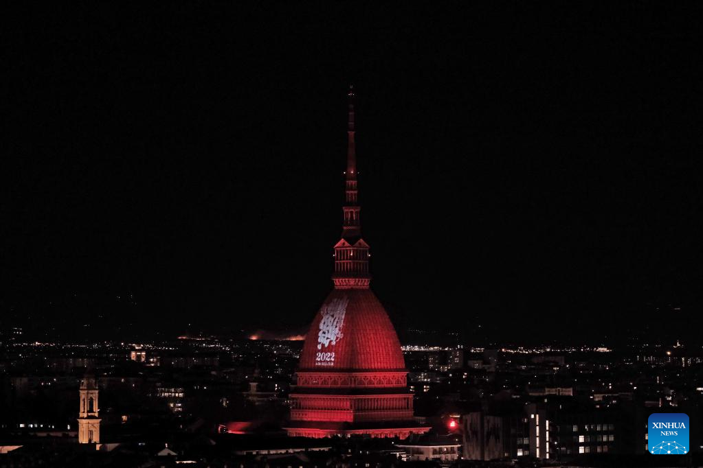 The Chinese character "Fu," meaning fortune and luck in English, and red light are projected onto the Mole Antonelliana to celebrate the Chinese Lunar New Year in Turin, Italy, on Jan. 31, 2022. (Photo by Federico Tardito/Xinhua)