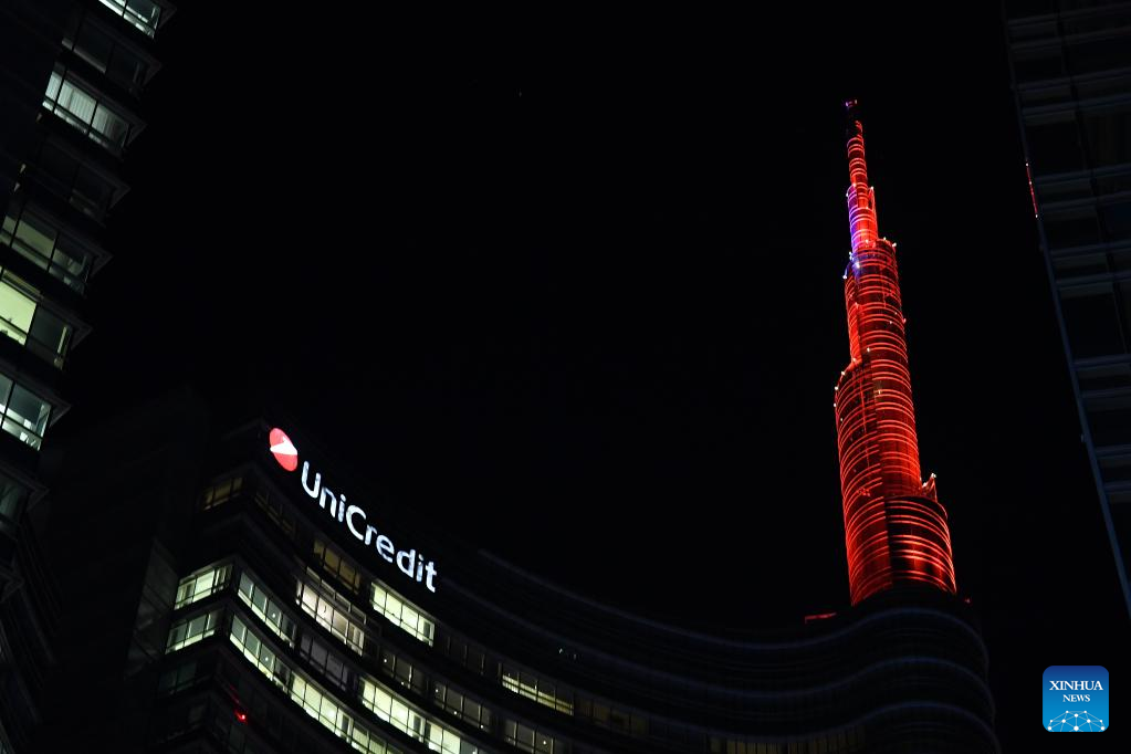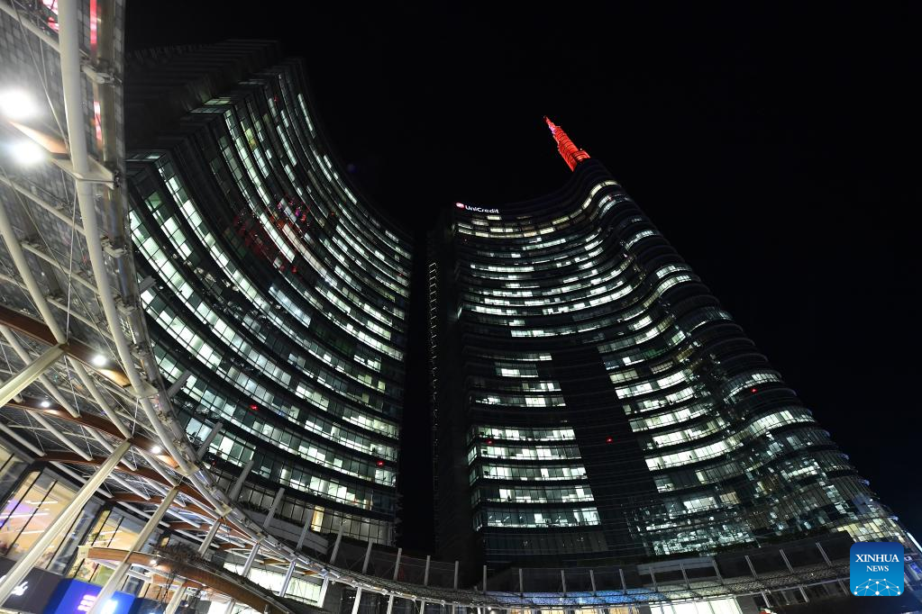 The top of the UniCredit Tower is illuminated with red light to celebrate the Chinese Lunar New Year in Milan, Italy, on Jan. 31, 2022. (Str/Xinhua)