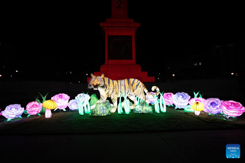 Photo taken on Jan. 31, 2022 shows lanterns at the bottom of Nelson's Column to celebrate the Chinese Lunar New Year at Trafalgar Square in London, Britain. (Xinhua/Li Ying)