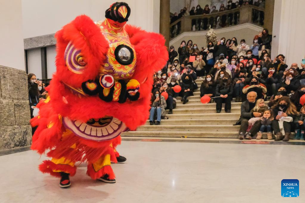 People watch a lion dance during a Chinese Lunar New Year celebration in Naples, Italy, on Jan. 31, 2022. (Str/Xinhua)