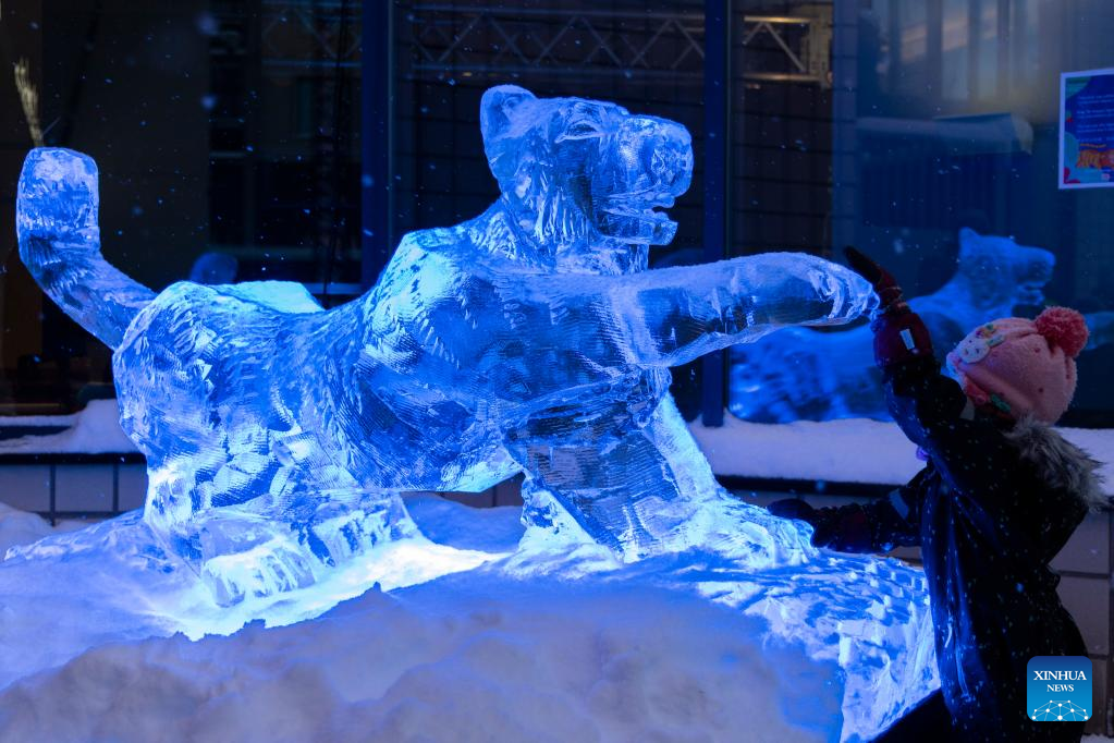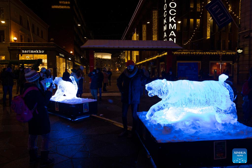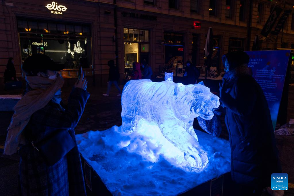 People visit an ice sculpture exhibition during a celebration of the Chinese Lunar New Year in Helsinki, Finland, on Jan. 31, 2022. (Photo by Matti Matikainen/Xinhua)