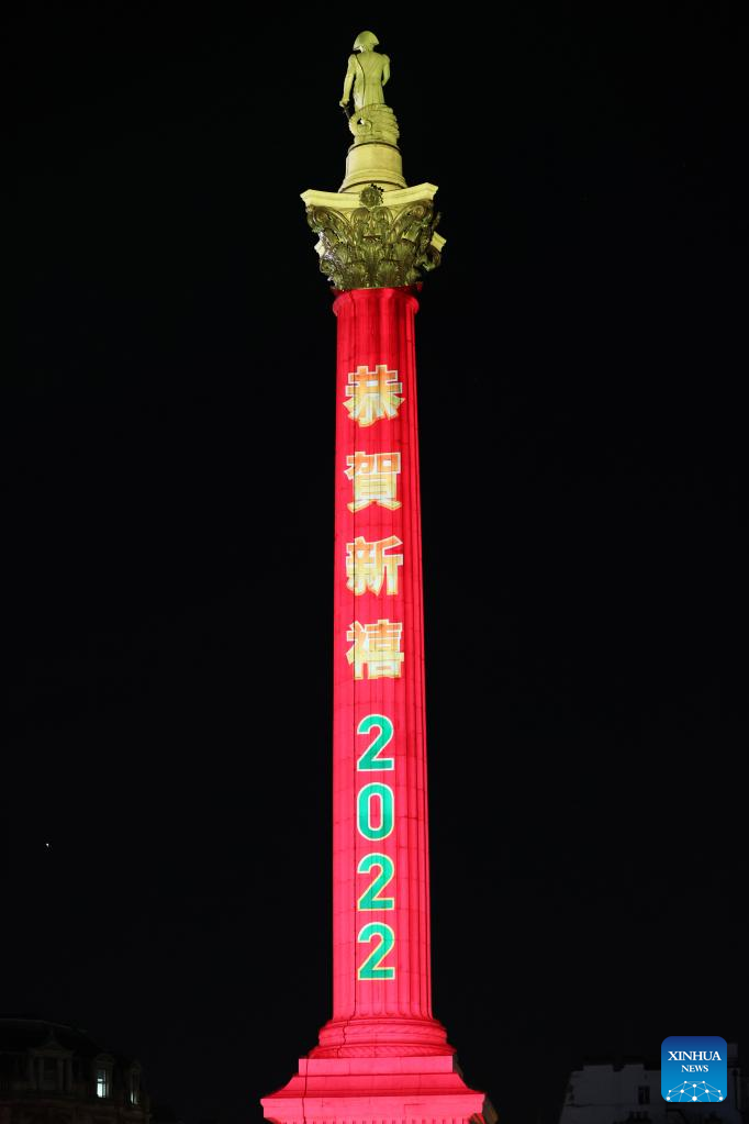 Photo taken on Jan. 31, 2022 shows the Nelson's Column illuminated in red to celebrate the Chinese Lunar New Year at Trafalgar Square in London, Britain. (Xinhua/Li Ying)