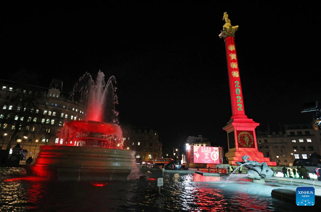 Photo taken on Jan. 31, 2022 shows the Nelson's Column and a fountain illuminated in red to celebrate the Chinese Lunar New Year at Trafalgar Square in London, Britain. (Xinhua/Li Ying)