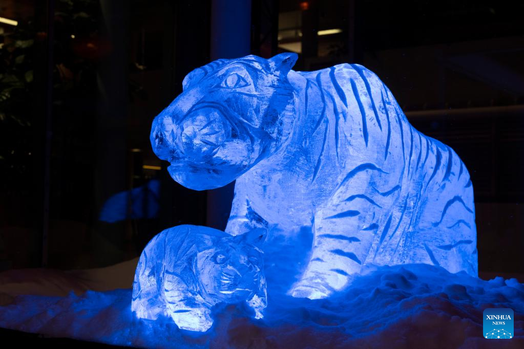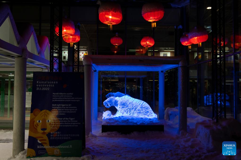 Photo taken on Jan. 31, 2022 shows an ice sculpture exhibited during a celebration of the Chinese Lunar New Year in Helsinki, Finland. (Photo by Matti Matikainen/Xinhua)