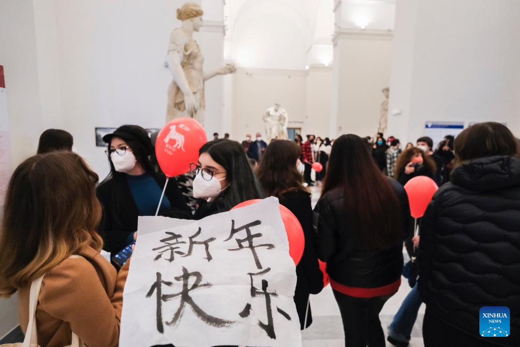 People attend a Chinese Lunar New Year celebration in Naples, Italy, on Jan. 31, 2022. (Str/Xinhua)