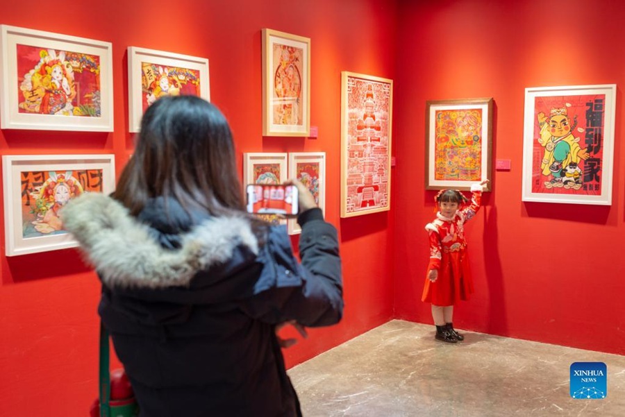 A child poses for photos at an exhibition of New Year pictures in Xicheng District of Beijing, capital of China, Feb. 1, 2022. The exhibition kicked off here on Jan. 25, featuring more than 270 New Year pictures created to commemorate the arrival of the lunar new year in the Chinese tradition. (Xinhua/Hu Zhixuan)