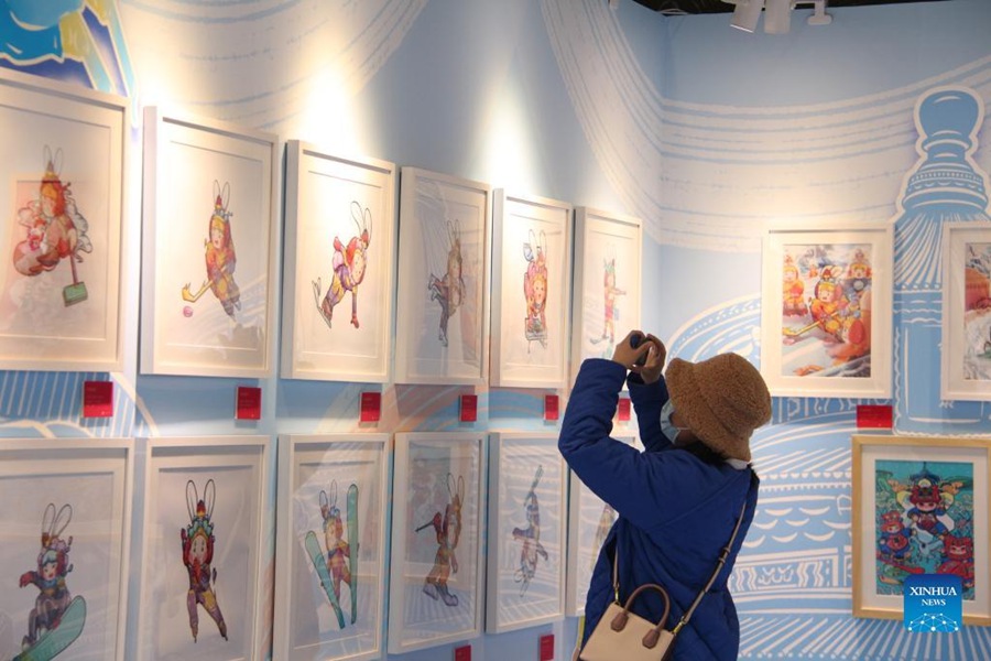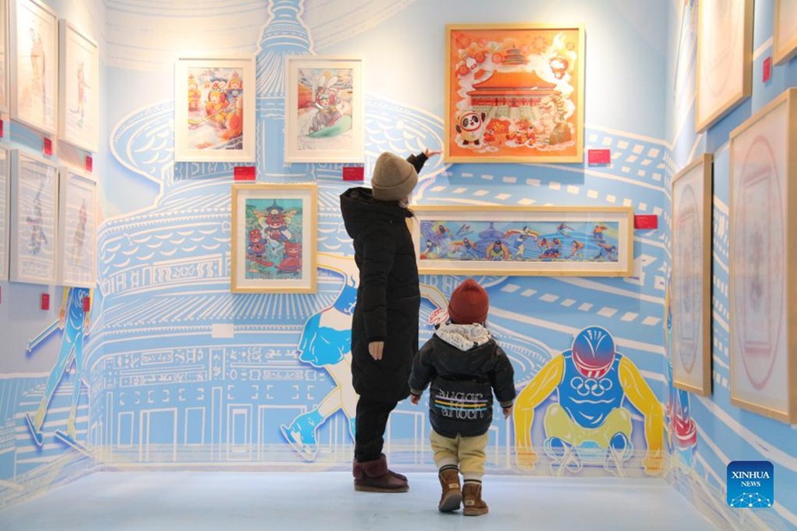 People visit an exhibition of New Year pictures in Xicheng District of Beijing, capital of China, Feb. 1, 2022. The exhibition kicked off here on Jan. 25, featuring more than 270 New Year pictures created to commemorate the arrival of the lunar new year in the Chinese tradition. (Xinhua/Tang Rufeng)