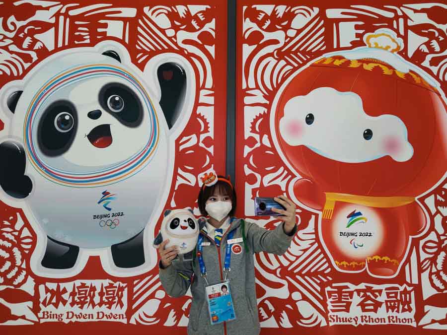 A volunteer poses for selfies at the Olympic Village for the Beijing 2022 Winter Olympics in Yanqing District of Beijing, capital of China, Jan. 31, 2022. (Photo by An Yaoyang/Xinhua)