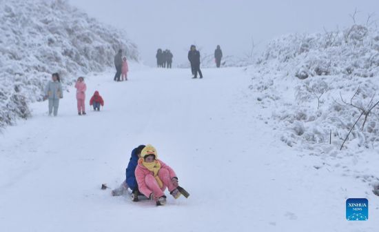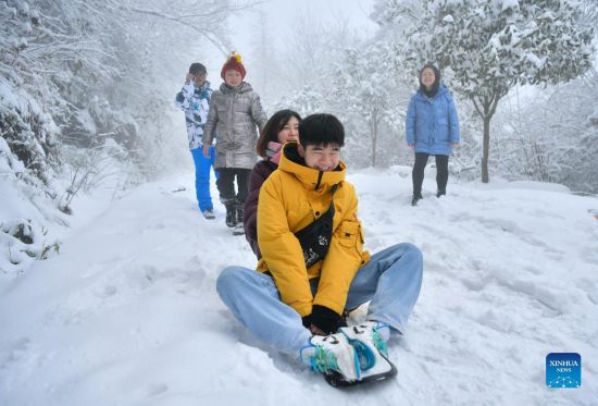Tourists enjoy themselves amid snow in Dongguanmen Village of Zhushan Town in Enshi Tujia and Miao Autonomous Prefecture, central China's Hubei Province on Feb. 2, 2022. Various activities are held during the Spring Festival holidays. (Photo by Song Wen/Xinhua)