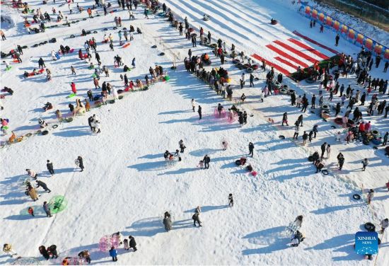 Tourists play at a snow park in Zaozhuang, east China's Shandong Province on Feb. 1, 2022. Various activities are held during the Spring Festival holidays. (Photo by Li Zongxian/Xinhua)