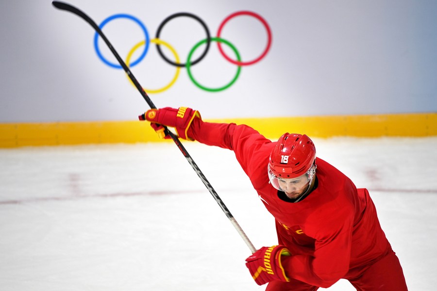 Ye Jinguang of China's men's ice hockey team in a training session at the National Indoor Stadium in Beijing, Feb. 2, 2022. (Xinhua/Li Ziheng)