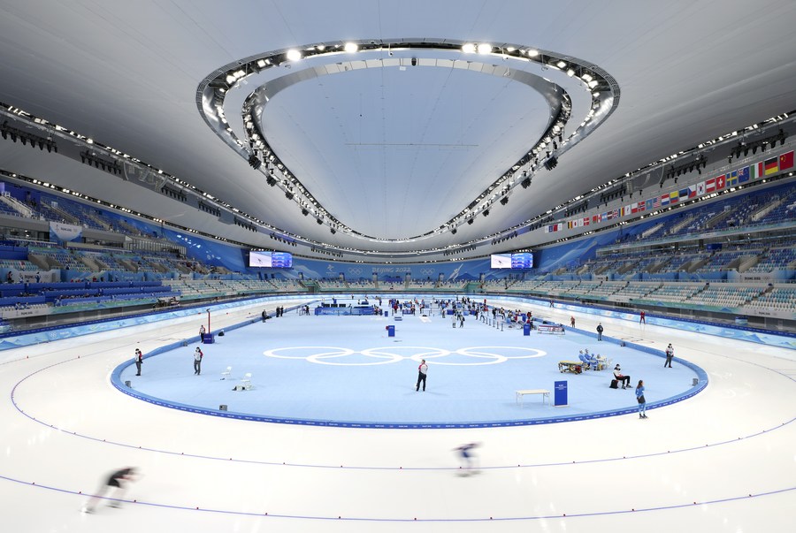 Athletes attend a group training session at the National Speed Skating Oval in Beijing, Jan. 31, 2022. (Xinhua/Wang Fei)