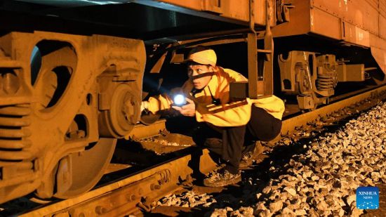 A staff member checks a freight train at a railway station in Liuzhou, south China's Guagnxi Zhuang Autonomous Region, Jan. 31, 2022. On the eve of the Chinese Lunar New Year, staff members at the railway station stuck to their posts to ensure the safe operation of the trains. (Xinhua/Zhang Ailin)