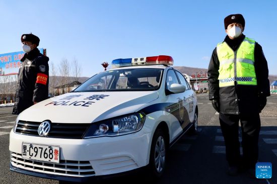 Policemen are on duty at a highway entrance in Suifenhe, northeast China's Heilongjiang Province, Jan. 31, 2022. To stem a new wave of COVID-19 resurgence, people from different walks in Suifenhe stick to their post and fight against the epidemic as the Spring Festival holiday approaches. (Xinhua/Xu Kaixin)