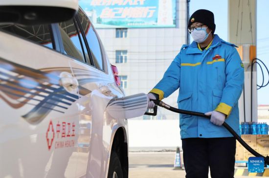 A staff member tanks a car up at a gas station in Suifenhe, northeast China's Heilongjiang Province, Jan. 31, 2022. To stem a new wave of COVID-19 resurgence, people from different walks in Suifenhe stick to their post and fight against the epidemic as the Spring Festival holiday approaches. (Xinhua/Xu Kaixin)