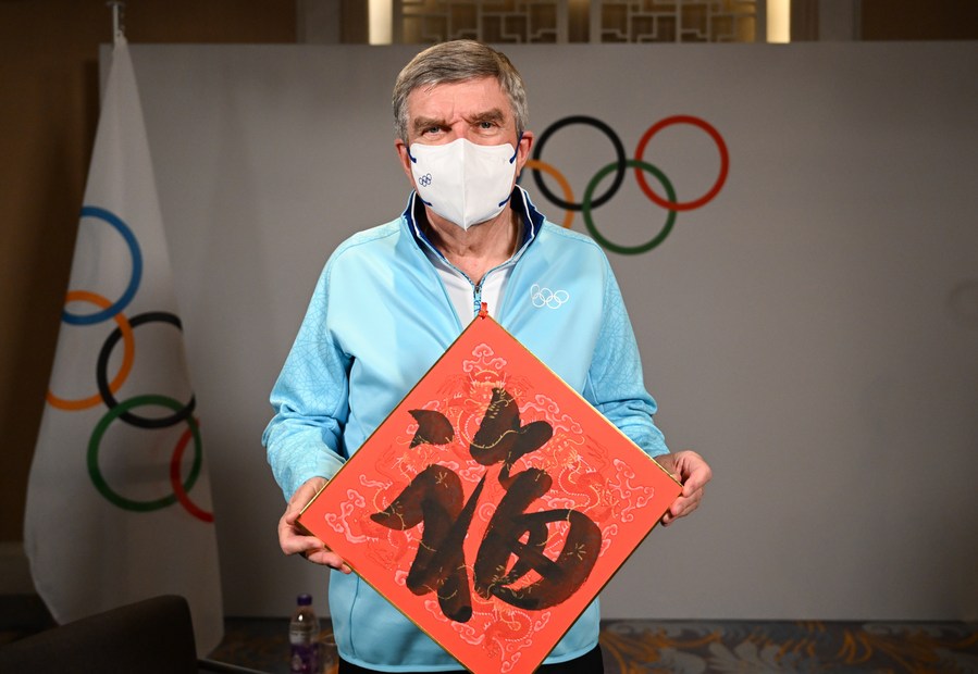 President of the International Olympic Committee Thomas Bach shows the Chinese character "Fu", meaning fortune and luck in English during an interview in Beijing, capital of China on Jan. 31, 2022.(Xinhua/Ju Huanzong)