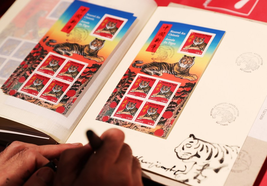 Paris-based Chinese artist Chen Jianghong signs on the Year of Tiger commemorative stamps designed by him during an issuing ceremony in Paris, France, Jan. 22, 2022. (Xinhua/Gao Jing)