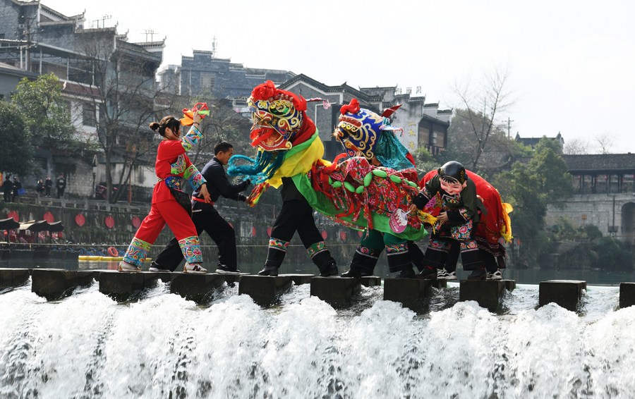 Artists perform a lion dance to celebrate the Chinese Spring Festival in Jishou City of Xiangxi Tujia and Miao Autonomous Prefecture, central China's Hunan Province, Feb. 3, 2022. (Photo by Yao Fang/Xinhua)