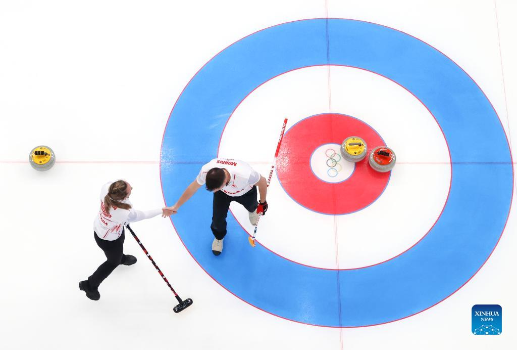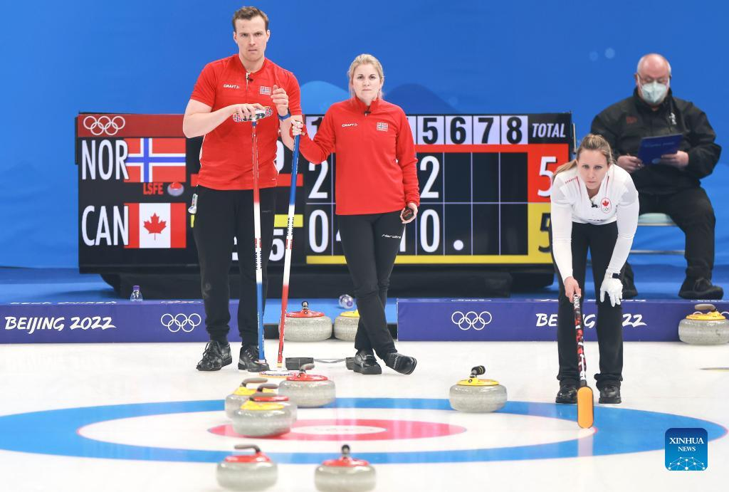 John Morris (R) and Rachel Homan of Canada comepete during the curling mixed doubles round robin event of the Beijing 2022 Winter Olympics between Norway and Canada at National Aquatics Centre in Beijing, China, Feb. 3, 2022. (Xinhua/Liu Xu)