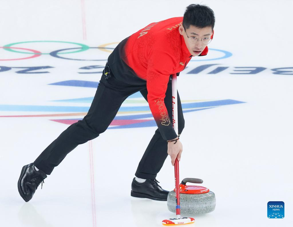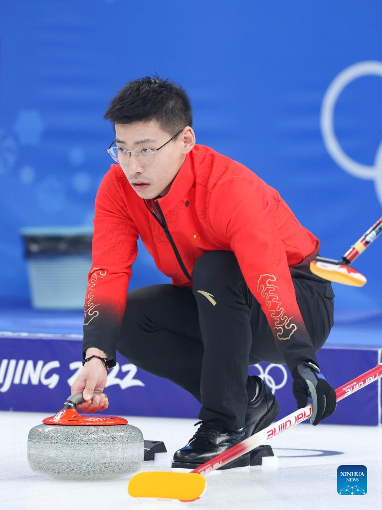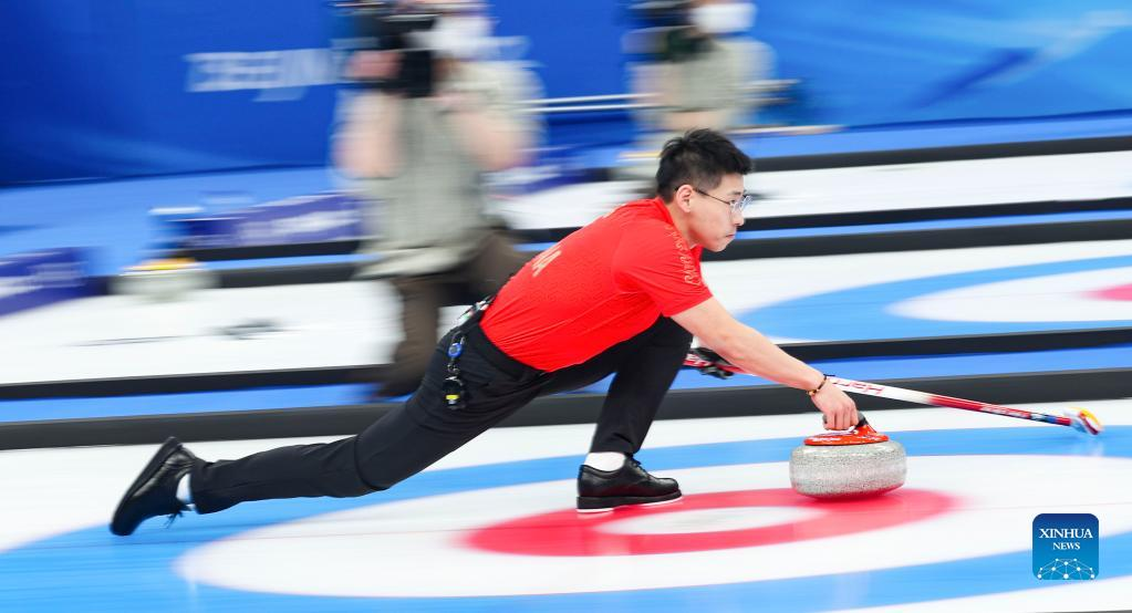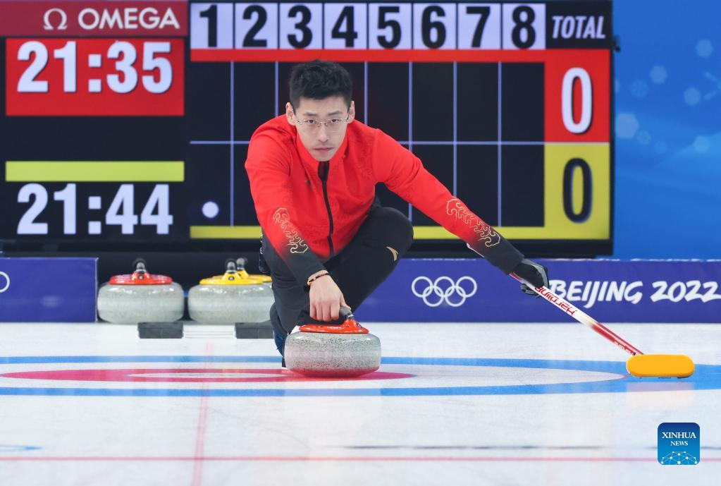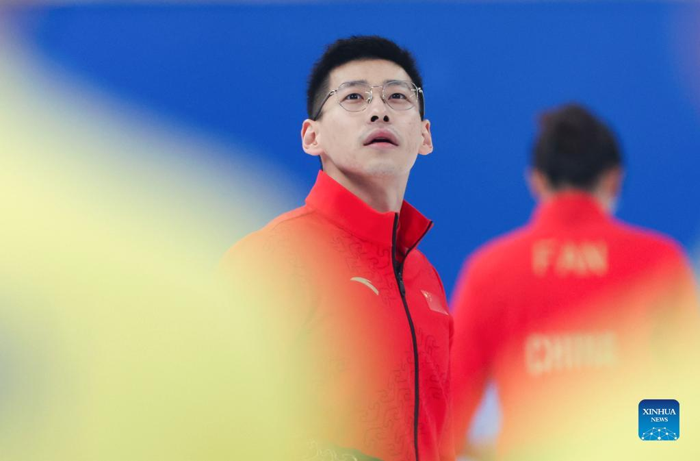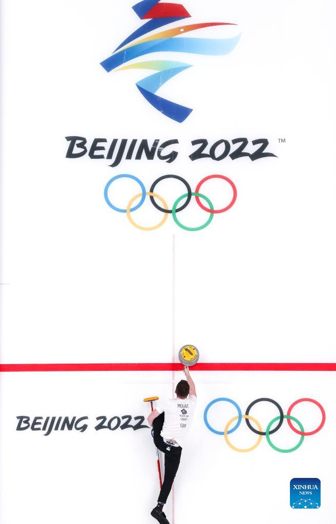 Bruce Mouat of Britain comepetes during the curling mixed doubles round robin event of the Beijing 2022 Winter Olympics between Switzerland and Britain at National Aquatics Centre in Beijing, China, Feb. 3, 2022. (Xinhua/Liu Xu)