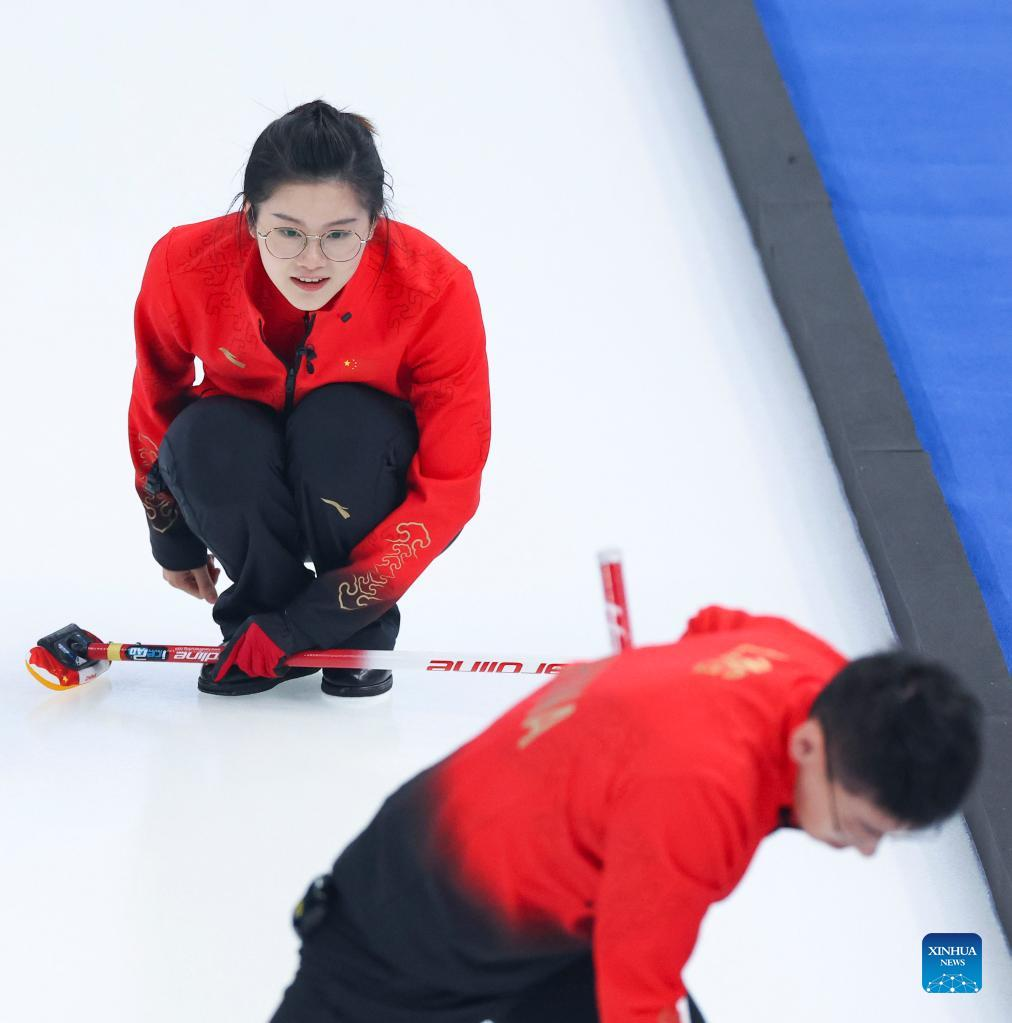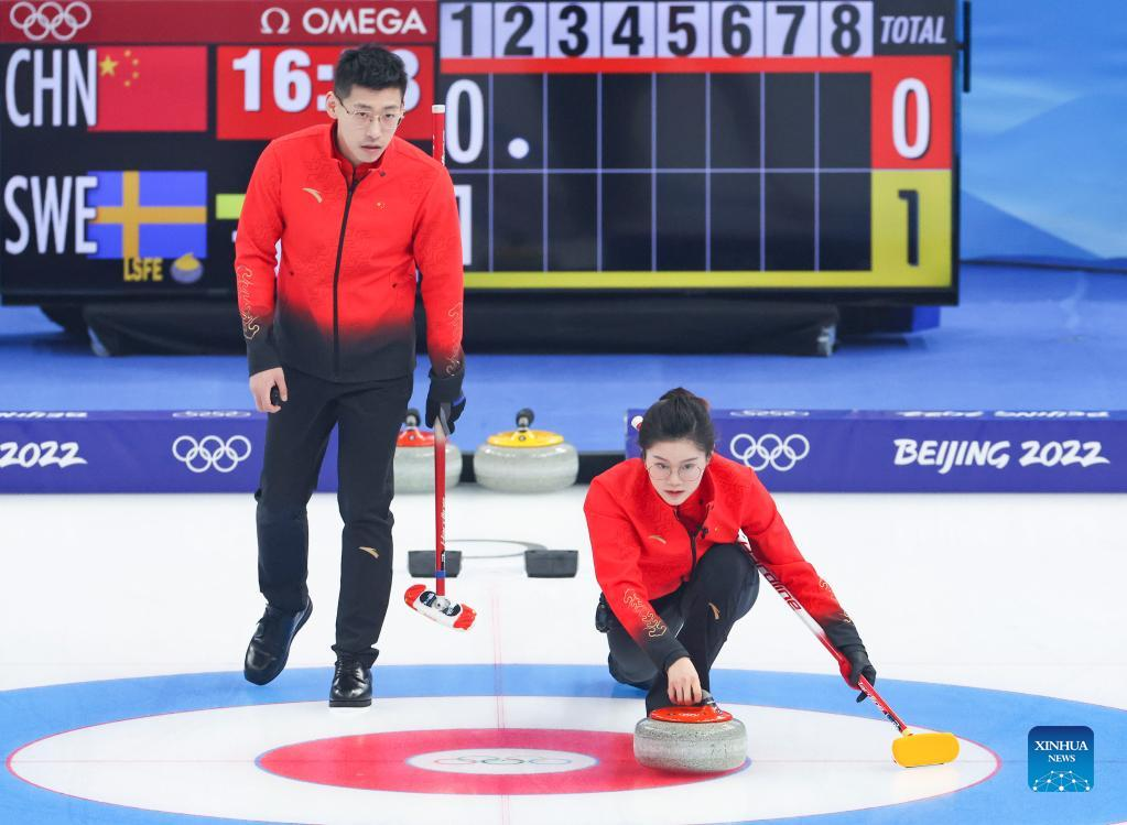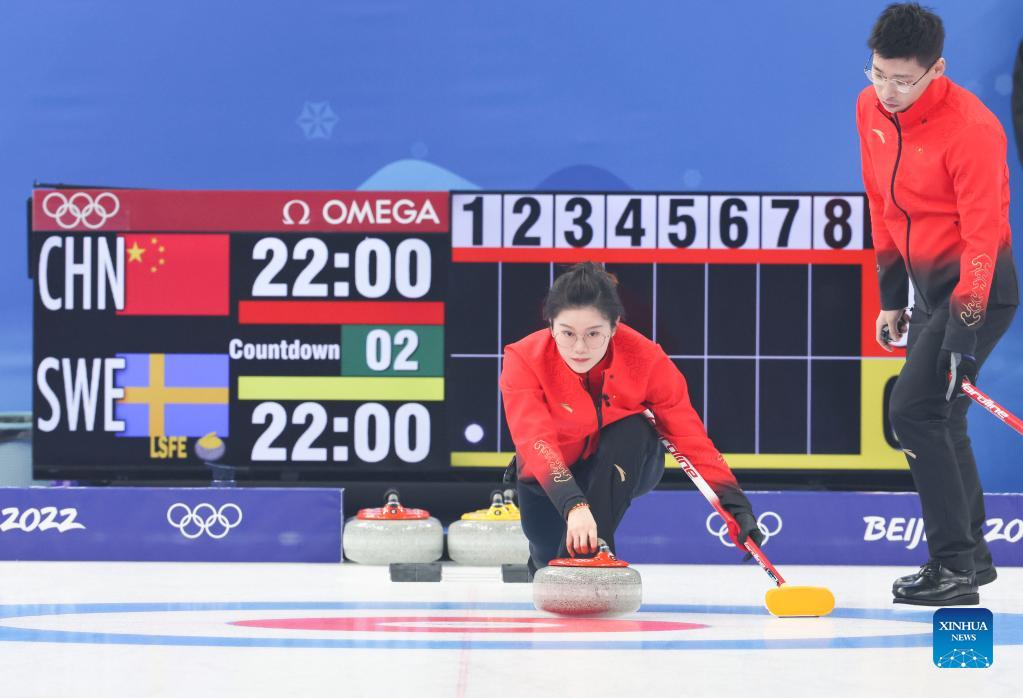 China's athletes Fan Suyuan and Ling Zhi compete during the curling mixed doubles round robin event of the Beijing 2022 Winter Olympics between China and Sweden at National Aquatics Centre in Beijing, China, Feb. 3, 2022. (Xinhua/Wang Jingqiang)