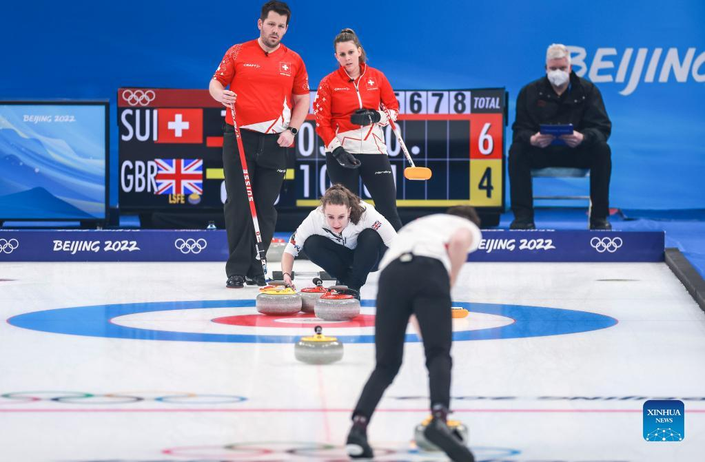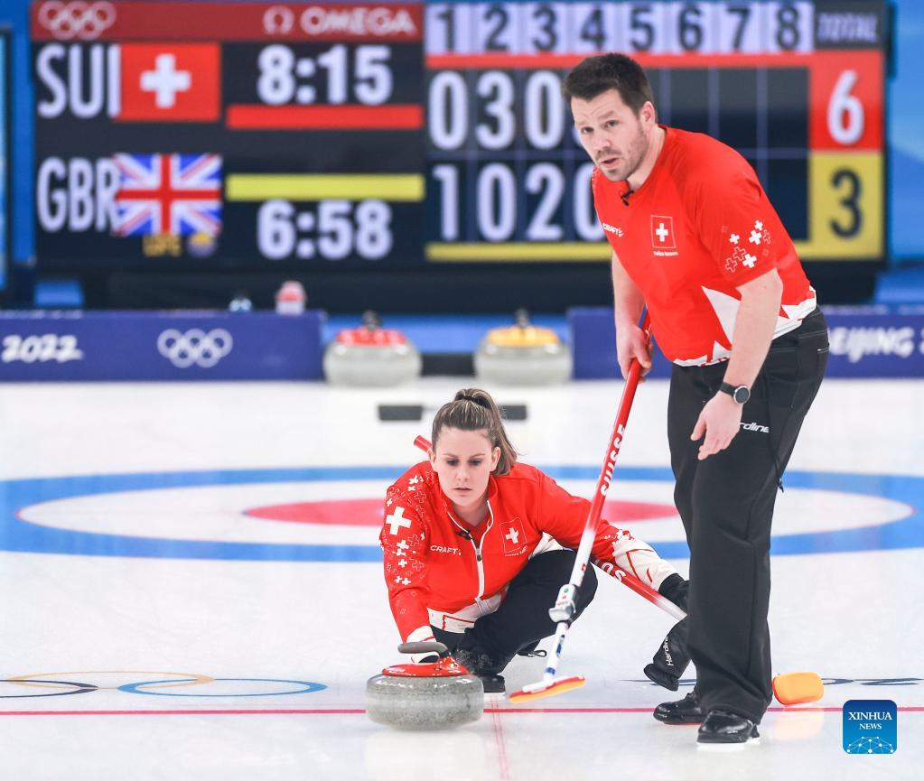 Martin Rios (R) and Jenny Perret of Switzerland comepete during the curling mixed doubles round robin event of the Beijing 2022 Winter Olympics between Switzerland and Britain at National Aquatics Centre in Beijing, China, Feb. 3, 2022. (Xinhua/Liu Xu)