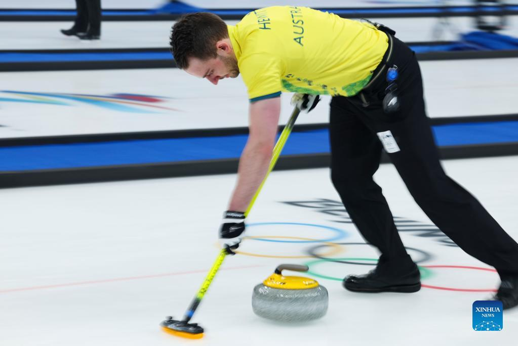 Australia's Dean Hewitt competes during the curling mixed doubles round robin session 4 of the Beijing 2022 Winter Olympics between the Czech Republic and Australia at the National Aquatics Center in Beijing, China, Feb. 3, 2022. (Xinhua/Wang Jingqiang)