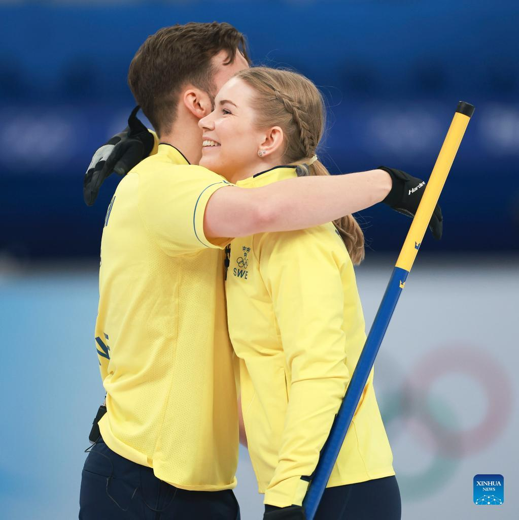 Sweden's Almida de Val (R) and Oskar Eriksson celebrate during the curling mixed doubles round robin event of the Beijing 2022 Winter Olympics between China and Sweden at National Aquatics Centre in Beijing, China, Feb. 3, 2022. (Xinhua/Liu Xu)