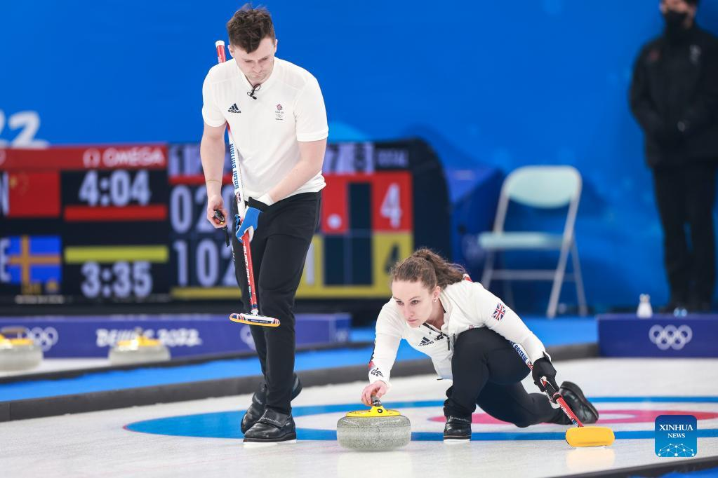 Bruce Mouat (front) and Jennifer Dodds of Britain comepete during the curling mixed doubles round robin event of the Beijing 2022 Winter Olympics between Switzerland and Britain at National Aquatics Centre in Beijing, China, Feb. 3, 2022. (Xinhua/Liu Xu)