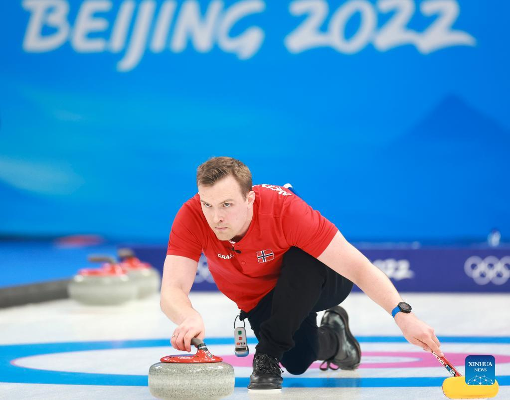 Magnus Nedregotten of Norway comepetes during the curling mixed doubles round robin event of the Beijing 2022 Winter Olympics between Norway and Canada at National Aquatics Centre in Beijing, China, Feb. 3, 2022. (Xinhua/Liu Xu)