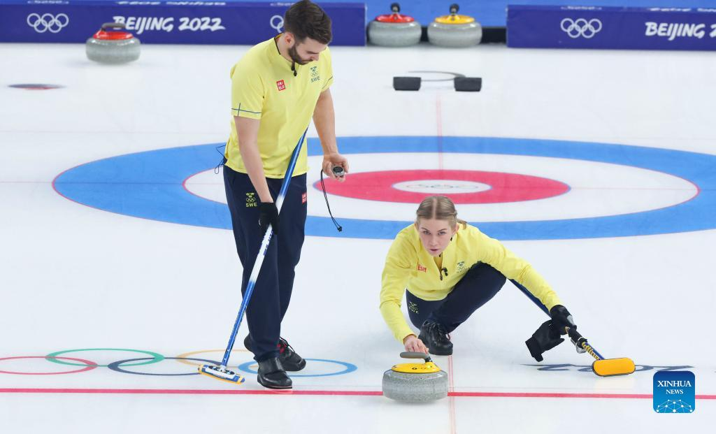 Sweden's atheletes Almida de Val (R) and Oskar Eriksson compete during the curling mixed doubles round robin event of the Beijing 2022 Winter Olympics between China and Sweden at National Aquatics Centre in Beijing, China, Feb. 3, 2022. (Xinhua/Wang Jingqiang)