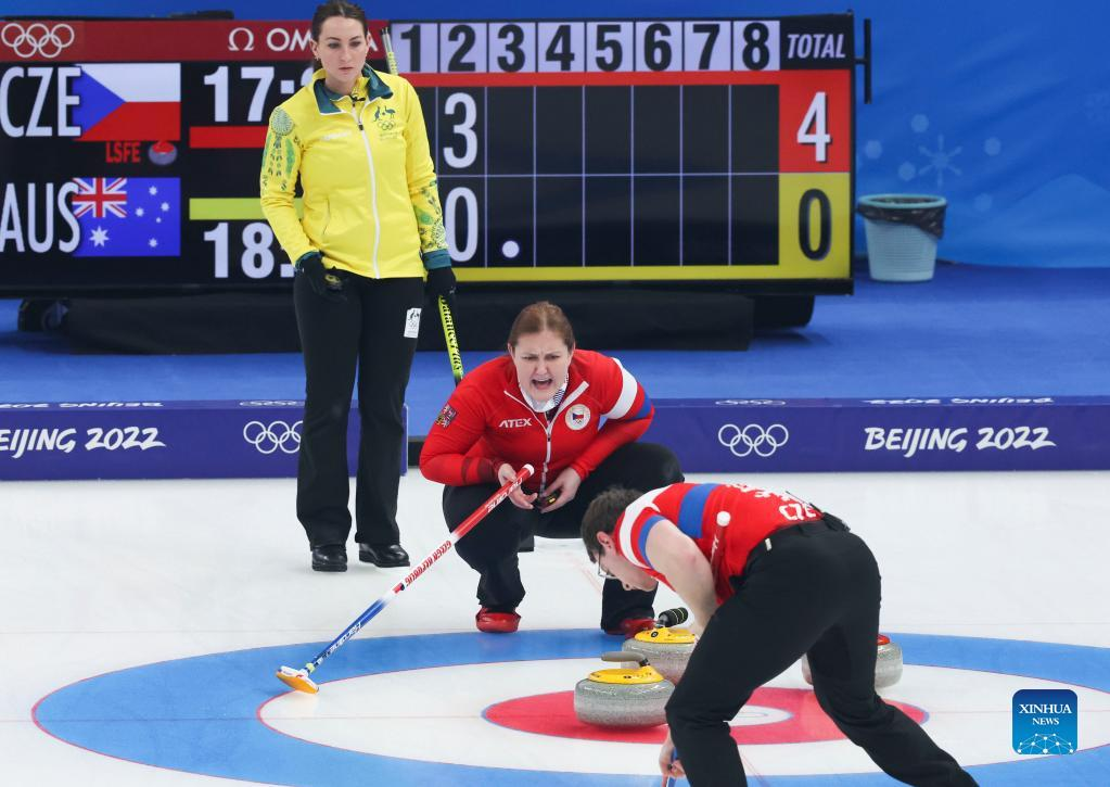 Zuzana Paulova (C) of the Czech Republic competes during the curling mixed doubles round robin session 4 of the Beijing 2022 Winter Olympics between the Czech Republic and Australia at the National Aquatics Center in Beijing, China, Feb. 3, 2022. (Xinhua/Wang Jingqiang)