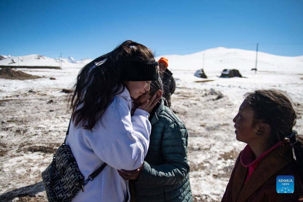 Tenzin Drolma (L) greets her grandmother in Gyaga Village of Damxung County, southwest China's Tibet Autonomous Region, Jan. 18, 2022. Tenzin Drolma, 21, was born on the grassland near Lake Namtso in Tibet. In 2020, she was admitted to Jiangsu Food and Pharmaceutical Science College in east China's Jiangsu Province as a Chinese pharmacy major student. The college life in the outside world is fresh to Drolma. She met many new classmates and made many friends. When winter vacation came, Drolma returned to her beloved home. "I leave my hometown in order to come back being a better person," she said. "I hope that when I graduate from college, I can help my family live a better life and I can be a useful person to my hometown and people here." (Xinhua/Sun Ruibo)