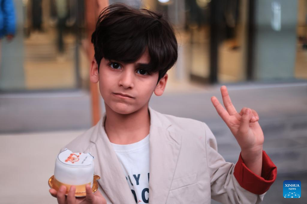 A boy holds a customized cake prepared by the Chinese Embassy in Saudi Arabia with the designs of Year of the Tiger 2022 in Riyadh, Saudi Arabia, Feb. 3, 2022. (Xinhua/Wang Haizhou)