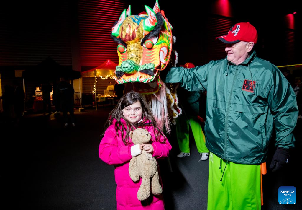 A girl poses for a photo at Chinese New Year Night Market in Dublin, Ireland, Feb. 3, 2022. (Photo by Liu Yanyan/Xinhua)