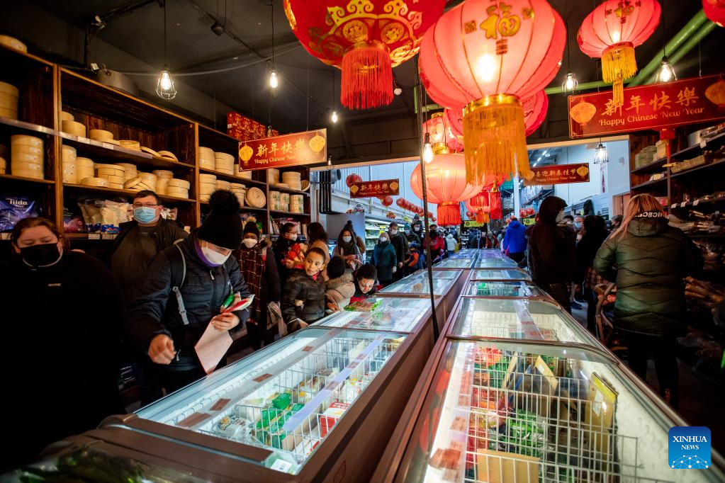 Visitors shop at Chinese New Year Night Market in Dublin, Ireland, Feb. 3, 2022. (Photo by Liu Yanyan/Xinhua)