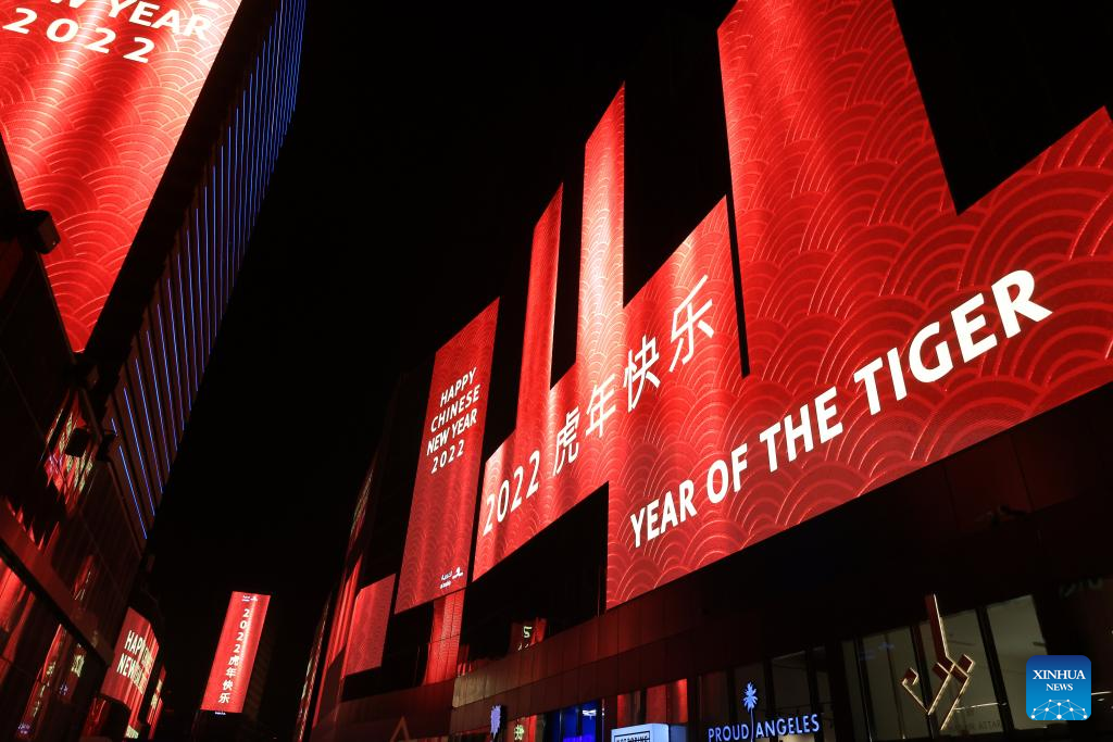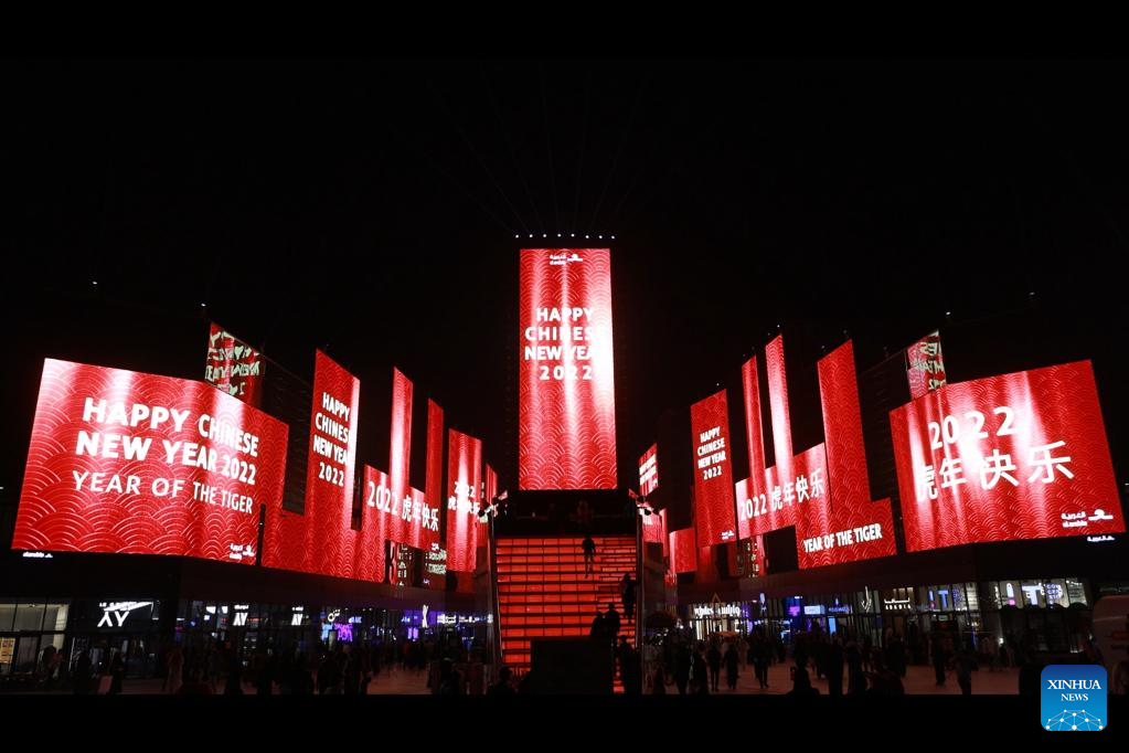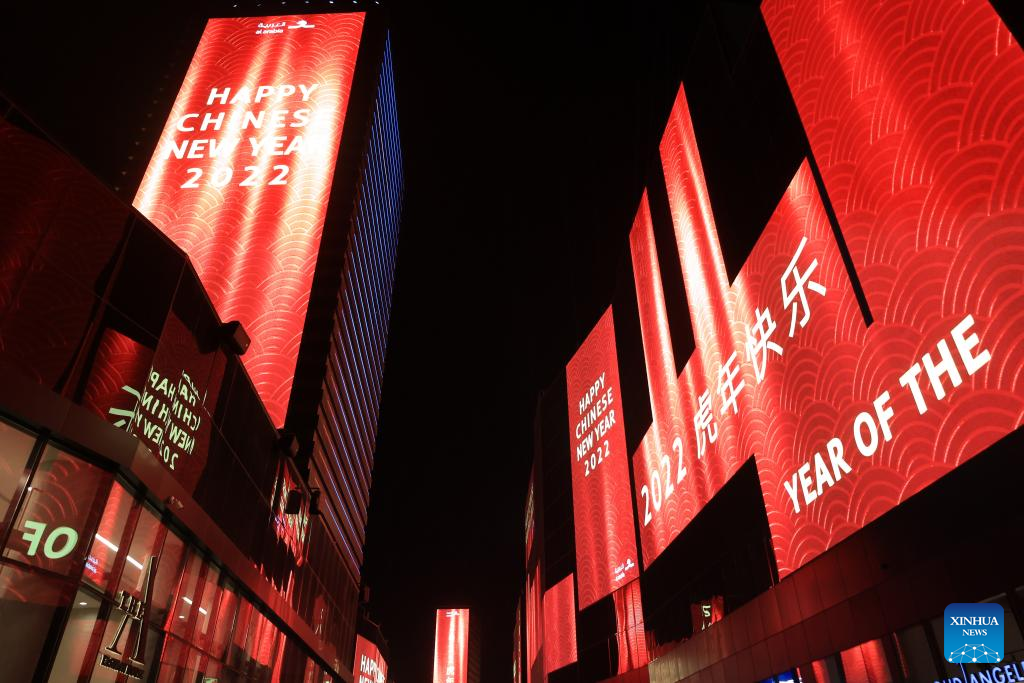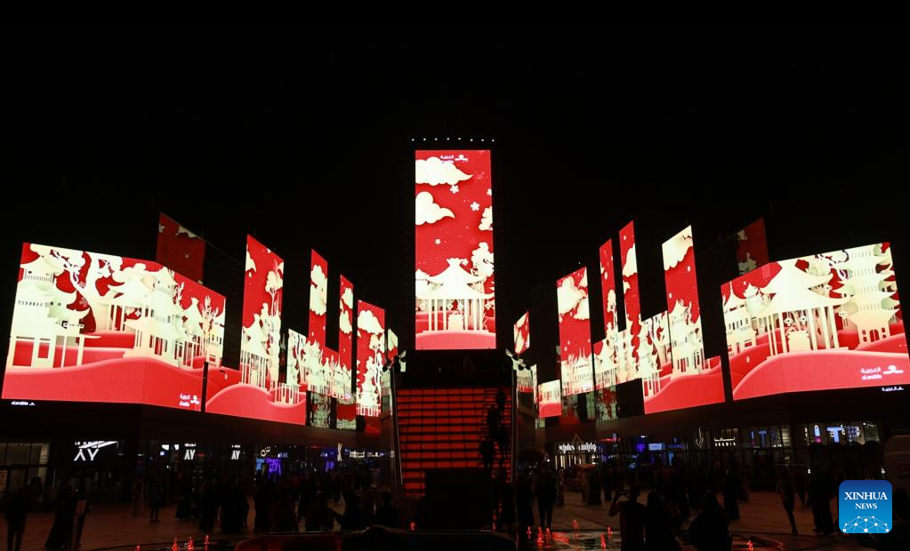 Photo taken on Feb. 3, 2022 shows Spring Festival themed videos played on LED screens to celebrate the Chinese New Year at the Riyadh Season Boulevard in Riyadh, Saudi Arabia. (Xinhua/Wang Haizhou)
