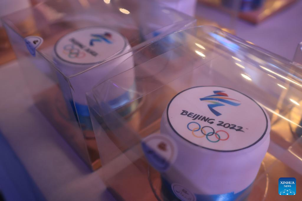 Photo taken on Feb. 3, 2022 shows customized cakes prepared by the Chinese Embassy in Saudi Arabia with the designs of Beijing Winter Olympics Emblem in Riyadh, Saudi Arabia. (Xinhua/Wang Haizhou)