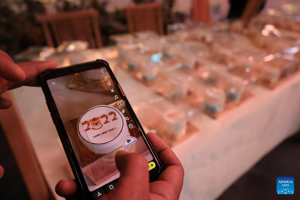 A visitor takes photos of customized cakes prepared by the Chinese Embassy in Saudi Arabia with the designs of Year of the Tiger 2022 in Riyadh, Saudi Arabia, Feb. 3, 2022. (Xinhua/Wang Haizhou)