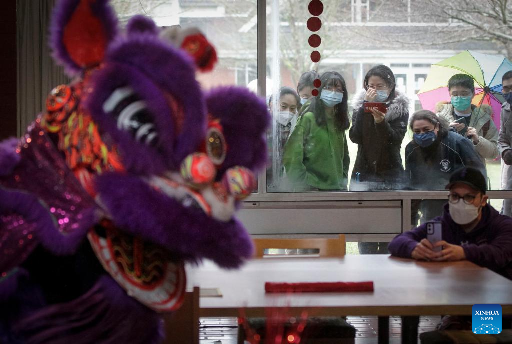 People watch a lion dance from outside through the windows at St. John's College, the University of British Columbia, in Vancouver, British Columbia, Canada, on Feb. 3, 2022. A lion dance was performed here on Thursday for people who may watch online or from outside through the windows, marking the Chinese New Year amid the COVID-19 pandemic. (Photo by Liang Sen/Xinhua)