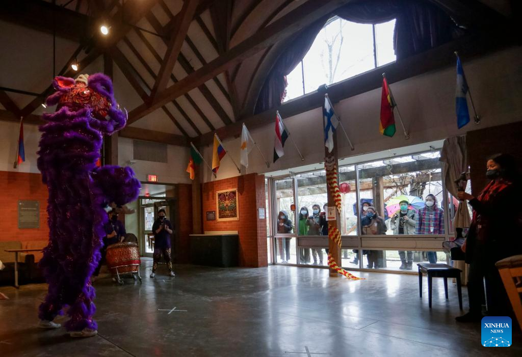 Lion dance performers demonstrate in front of a camera during an event at St. John's College, the University of British Columbia, in Vancouver, British Columbia, Canada, on Feb. 3, 2022. A lion dance was performed here on Thursday for people who may watch online or from outside through the windows, marking the Chinese New Year amid the COVID-19 pandemic. (Photo by Liang Sen/Xinhua)