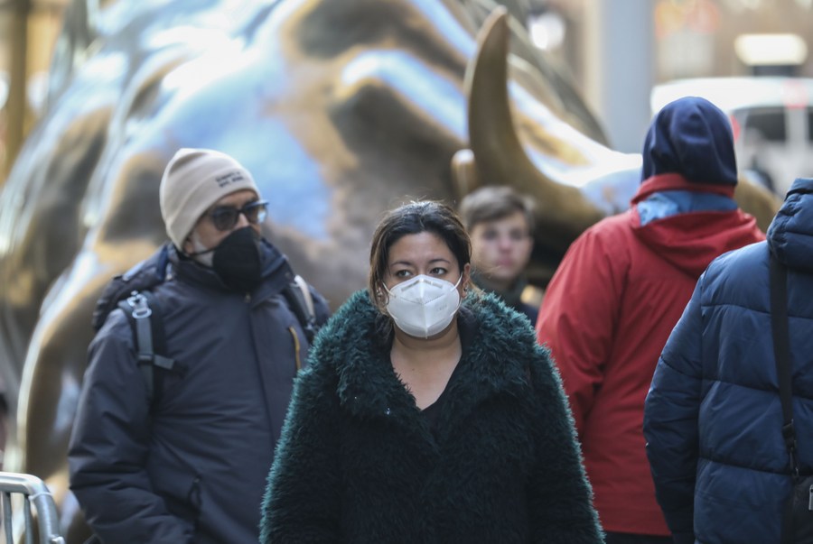 A woman wearing a face mask walks on a street in Manhattan of New York, the United States, Jan. 19, 2022. (Xinhua/Wang Ying)